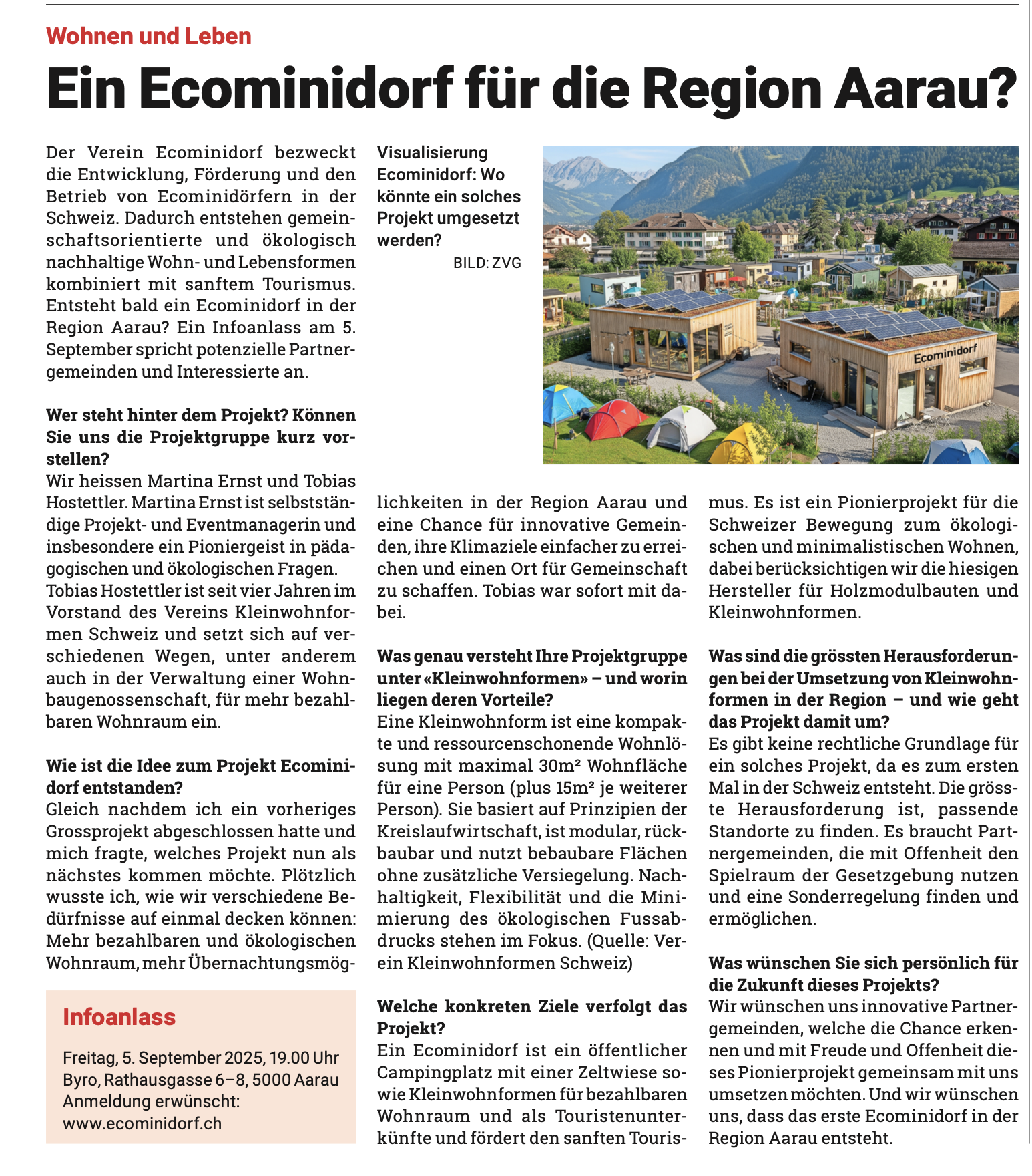 Der Verein Ecominidorf bezweckt die Entwicklung, Förderung und den Betrieb von Ecominidörfern in der Schweiz. Dadurch entstehen gemeinschaftsorientierte und ökologisch nachhaltige Wohn- und Lebensformen kombiniert mit sanftem Tourismus.